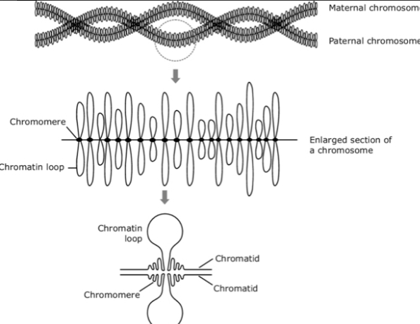 VIII. The main axis contains a series of thickening called chromomere and on each side of chromosome a pair of lateral loops are formed.