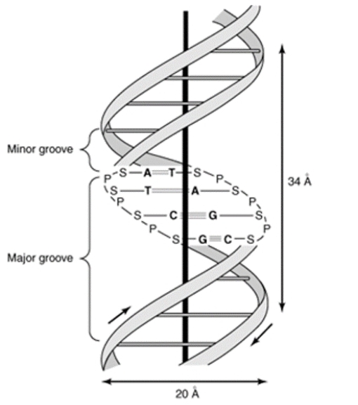 4. Each turn of the helix is 34A° ( 3.4 nm ) with 10 pairs of nucleotides each pair Placed at a distance of about 3.4A°.